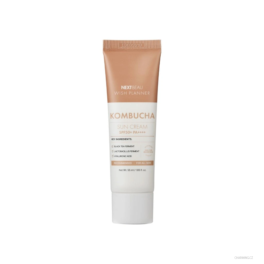 NEXTBEAU WISH PLANNER KOMBUCHA BIOME SUN CREAM SPF50+ PA++++je opalovací krém s kombuchou a probiotiky .Hydratační a ochranný opalovací krém poskytuje vysokou ochranu proti UVA a UVB záření. Díky lehké textuře se snadno roztírá po pokožce a vstřebává, nezanechává mastný film a zároveň vyživuje a revitalizuje pokožku. Jeho složení obsahuje kombuchu, probiotika, niacinamid, panthenol a rostlinné extrakty, které pomáhají udržovat zdravý mikrobiom pokožky, podporují její regeneraci a zklidňují podráždění. Tento krém je vhodný pro všechny typy pleti, včetně citlivé, a pomáhá redukovat jemné linky a zlepšovat pružnost pokožky. Kombucha (Saccharomyces/Xylinum/Black Tea Ferment) , bohatá na antioxidanty, podporuje zdravý mikrobiom pokožky. Probiotika (Lactobacillus Ferment, Saccharomyces Ferment, Aspergillus Ferment) posilují kožní bariéru a pomáhají udržovat rovnováhu pleti. Niacinamid pomáhá redukovat pigmentaci, podporuje syntézu kolagenu a zlepšuje pružnost pokožky. Panthenol , provitamin B5, hydratuje, zklidňuje a regeneruje pokožku. Pomáhá posilovat kožní bariéru, chrání před podrážděním a podporuje hojení drobných poranění2. Hyaluronová kyselina intenzivně hydratuje a pomáhá udržet vláhu v pokožce. Aloe vera (Aloe Barbadensis Leaf Extract) zklidňuje a regeneruje pokožku. Titanium Dioxide & Zinc Oxide , minerální UV filtry poskytující širokospektrální ochranu. Tocopherol (Vitamin E) , silný antioxidant, chrání pokožku před volnými radikály. Produkt chrání pokožku před slunečním zářením, zároveň intenzivně pečuje o její zdraví.