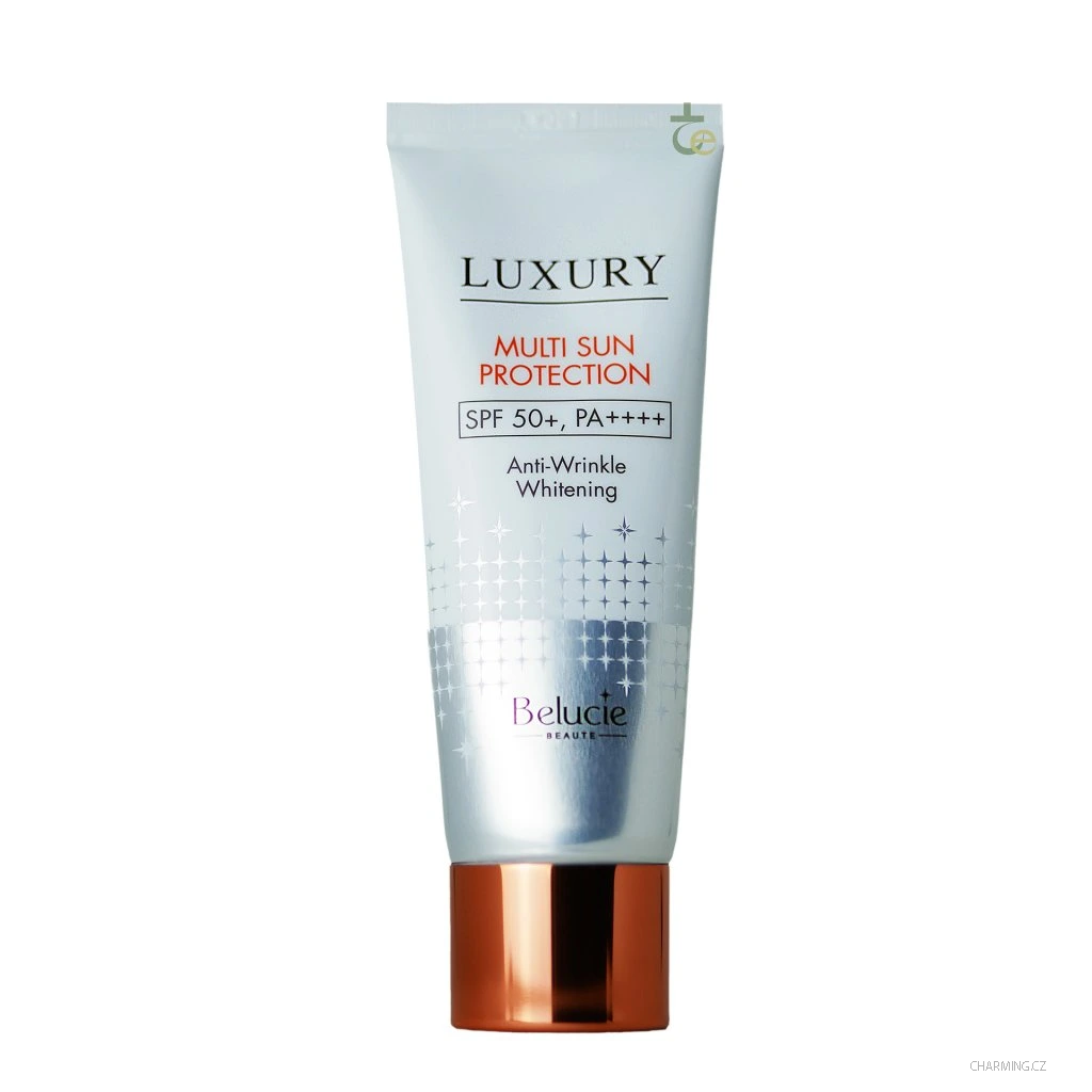 Belucie Luxury Multi Sun Protection je multifunkční přípravek s certifikovaným trojím účinkem: poskytuje nejvyšší ochranu před sluncem, intenzivně rozjasňuje pleť a efektivně vyhlazuje vrásky. Díky lehké, hydratační textuře se krém okamžitě vstřebává a zanechává pleť svěží, bez pocitu lepkavosti. Unikátní složení s obsahem minerálních pigmentů dodává pokožce přirozený, zdravý jas a sjednocuje její vzhled. Trojí funkčnost v jedné tubě. Ochrana (UV protection), rozjasnění (Whitening) a péče o vrásky (Anti-wrinkle). Maximální štít: SPF50+ a PA++++ zajišťují špičkovou bariéru proti UVA i UVB záření. Obsahuje slídu (Mica) a jemné minerální oxidy pro okamžitý projasňující efekt. Moderní složení bez zakázaných látek, vhodné pro každodenní použití. Obsahuje Aloe Barbadensis (Voda z listů a extrakt):, dvojitá síla aloe pro hlubokou hydrataci, zklidnění pleti po slunění a regeneraci Niacinamide (Vitamín B3) viditelně rozjasňuje unavenou pleť, pomáhá sjednocovat tón a předcházet pigmentovým skvrnám. Adenosine, účinná látka v boji proti stárnutí, která prokazatelně vyhlazuje jemné linky a zlepšuje pevnost pleti. Dipotassium Glycyrrhizate (Lékořice) pro zklidnění citlivé pokožky a potlačení začervenání způsobeného UV zářením.